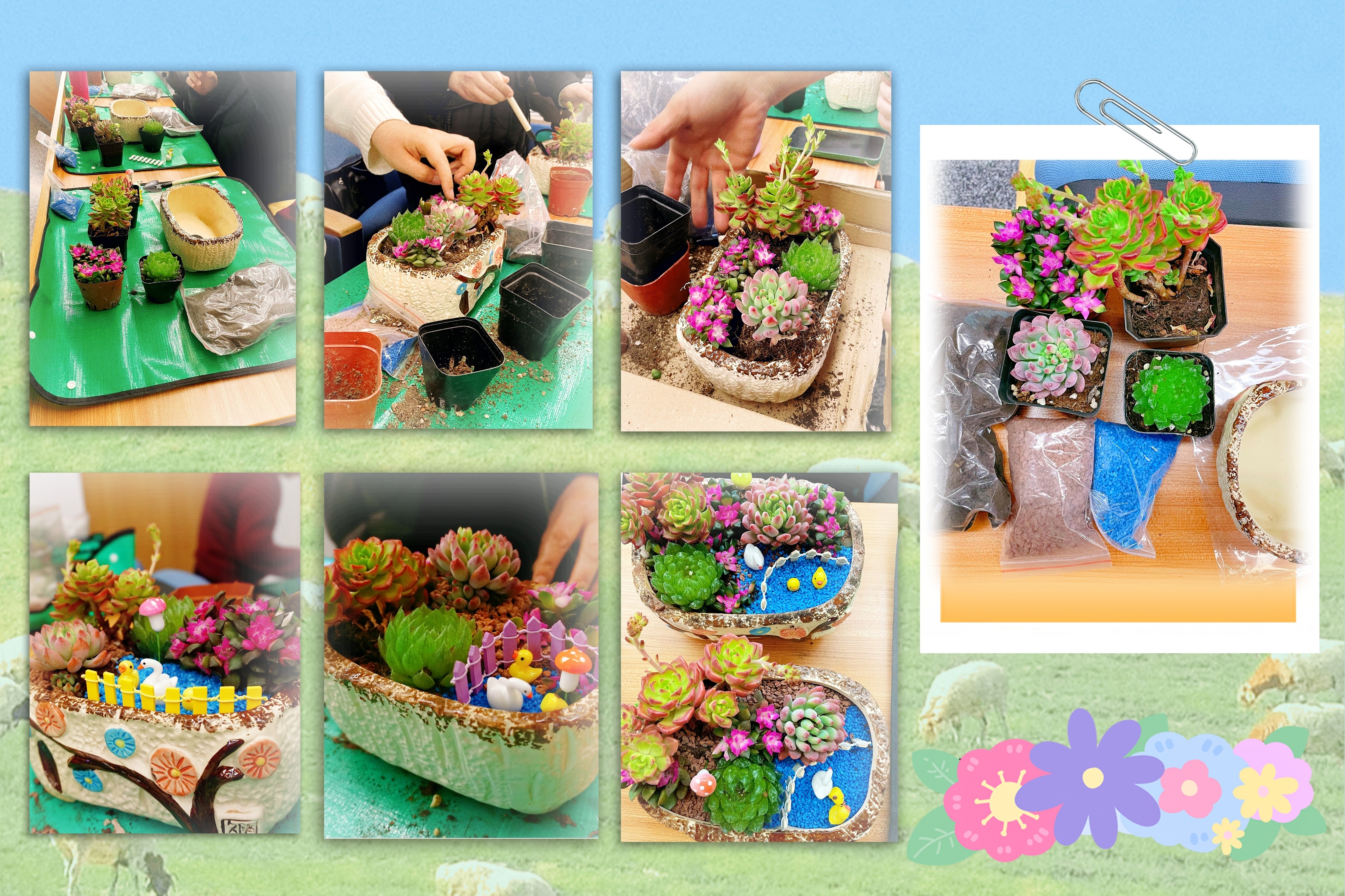 当前,正值春季,温度适宜,这无疑是多肉植物的生长旺季,也是其繁殖的最佳时节。教职工们纷纷动手制作,小心翼翼地取出一株株精美的多肉植物,用小铲子将营养土填充至微景观花盆中,精心调整多肉植物的位置,再按照自己的喜好用彩石、小鸭子、天鹅、栅栏等装饰品点缀盆景,全程不亦乐乎。短短的时间内,一盆盆错落有致的“多肉微景观”艺术品展现在大家面前。